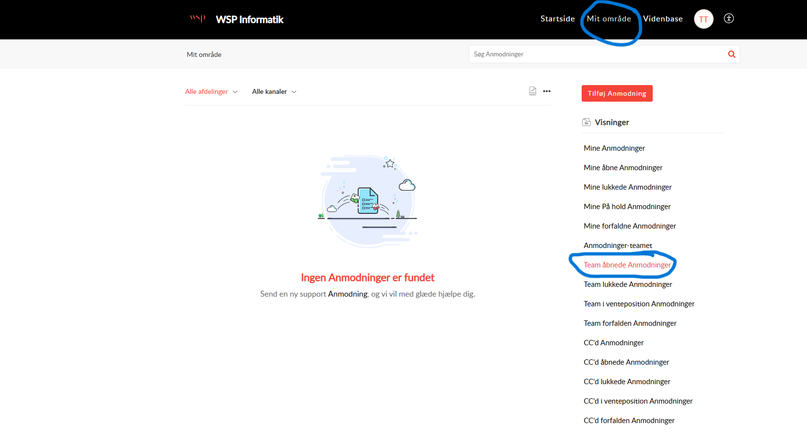 Tryk på "Team åbnede Anmodninger" knappen for at se alle dine kollegers supportsager hos os.